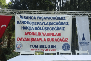 Ayrıca imza törenine katılım gösteren İzmir Büyükşehir Belediyesi ve bağlı kuruluşlarındaki tüm bürokratlara, Sendikamız ve KESK MYK üyelerine, tüm katılımcı kurum kuruluşlara ve alanda bizleri yalnız bırakmayan siz değerli emekçilere teşekkür ederiz.