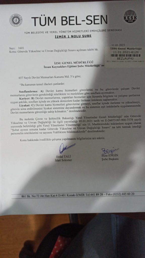 Çevre Şehircilik Bakanlığı Yerel Yönetimler Genel Müdürlüğü’nün Görevde Yükselme ve Ünvan Değişikliği ile ilgili yayınladığı 05.01.2021 tarih ve E-26073187-900-7579 sayılı yazısında belirtildiği gibi Yerel Yönetimler Yönetmeliği’nin 11.Maddesindeki hükümlere uygun olarak “Şubat ayı sonuna kadar Görevde Yükselme ve Unvan Değişikliği Sınavı”na tabi tutmak istediği personelin niteliklerini ve sayısını Valiliklere bildireceklerdir” denildiği yazısına istinaden ilgili çalışmanın ivedilikle yapılması konusundaki talep yazımızı İzmir Büyükşehir Belediyesi ve İZSU Genel Müdürlüğü’ne ilettik.