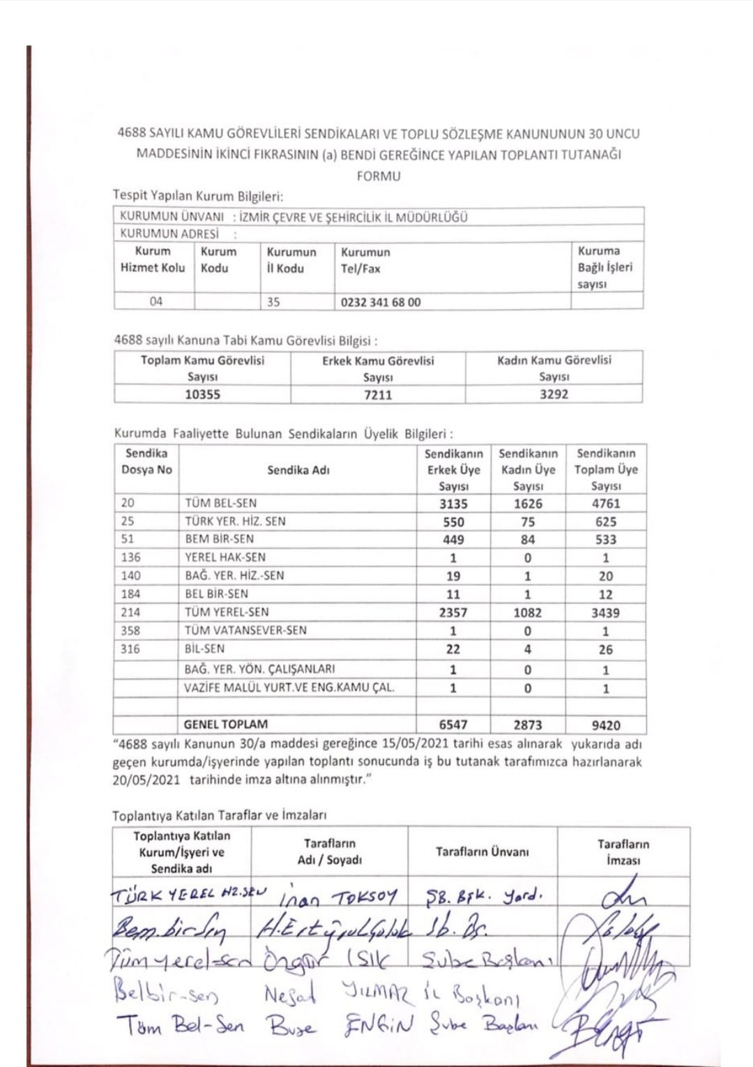 Aynı zamanda 20.05.2021 günü Çevre ve Şehircilik İl Müdürlüğü’nde yapılan toplantı sonucuna göre üye sayılarıyla İl genelinde birinci sendika olduk.